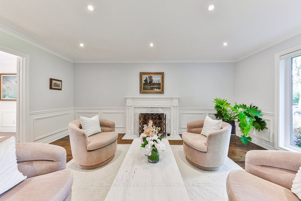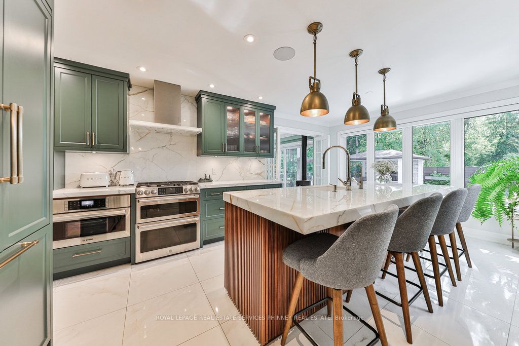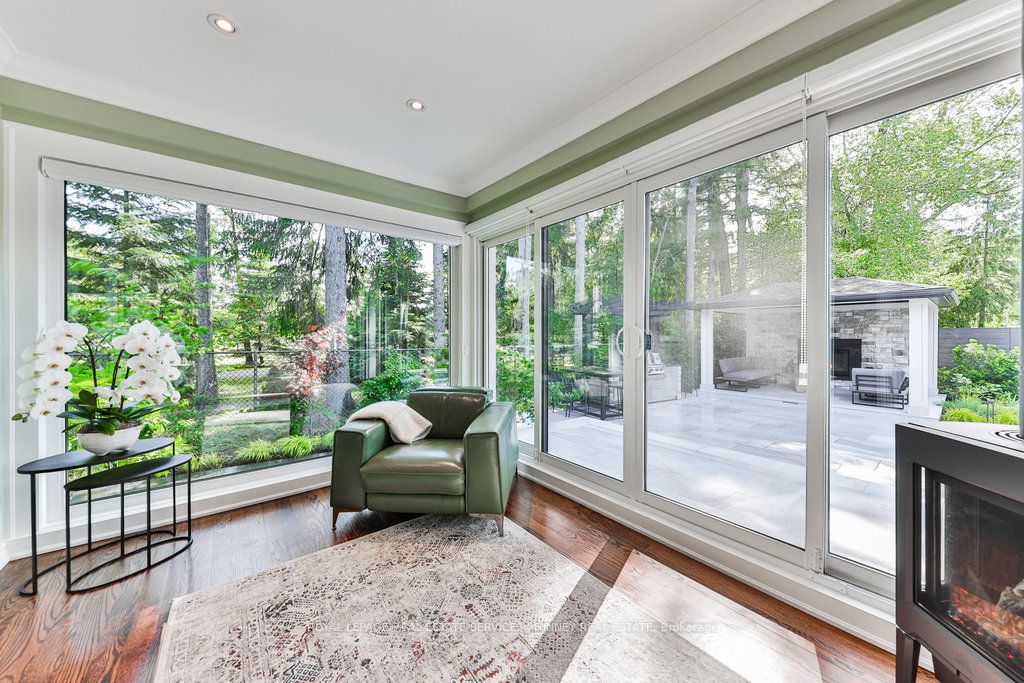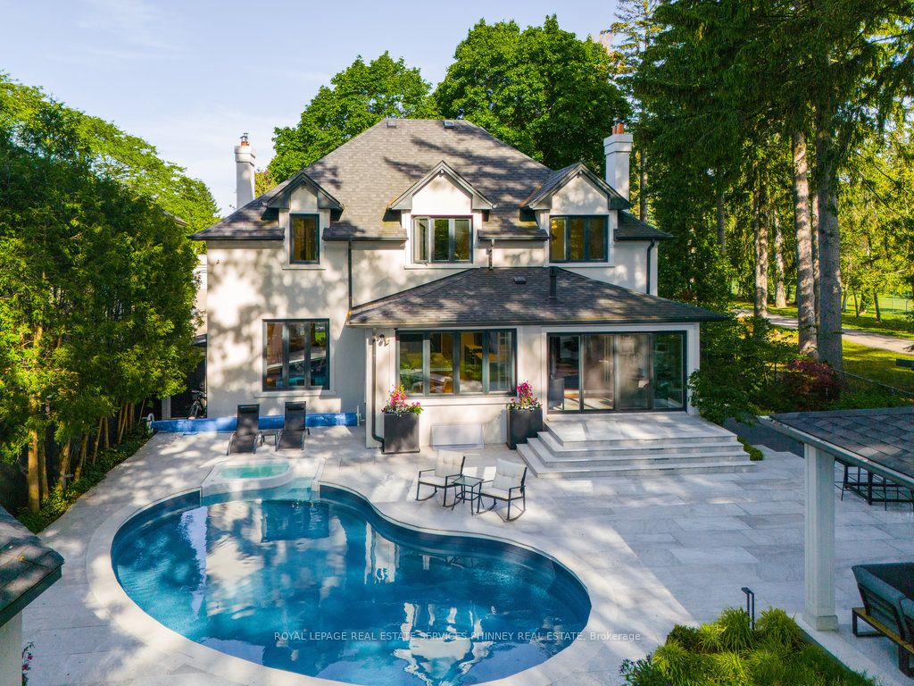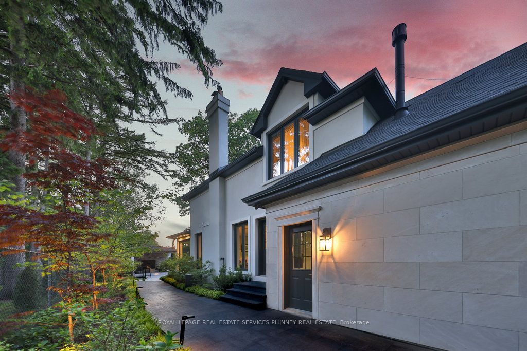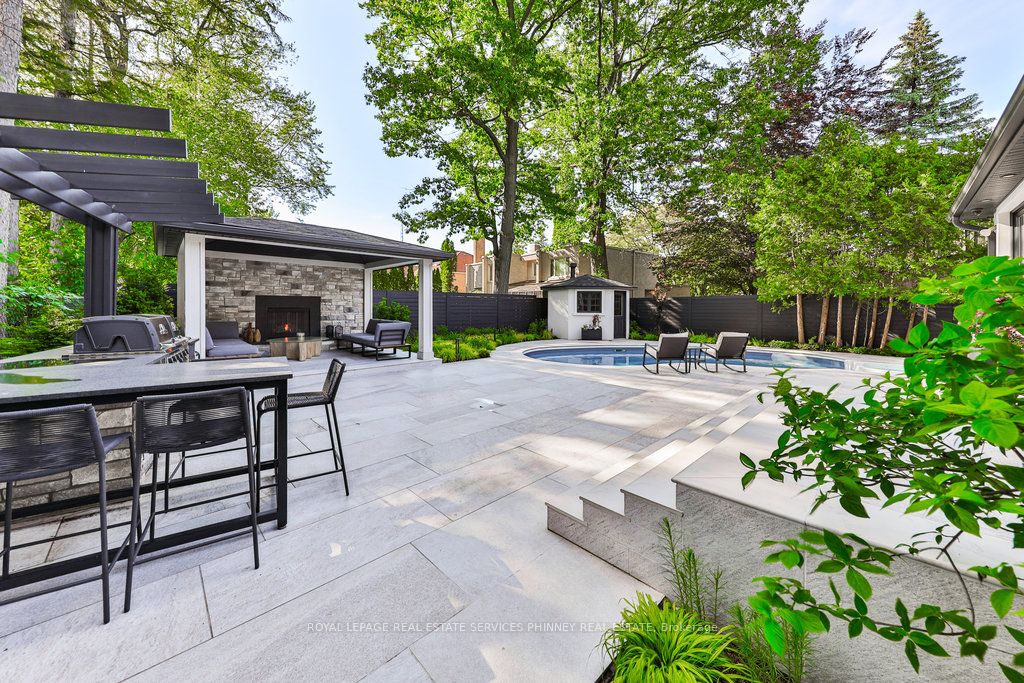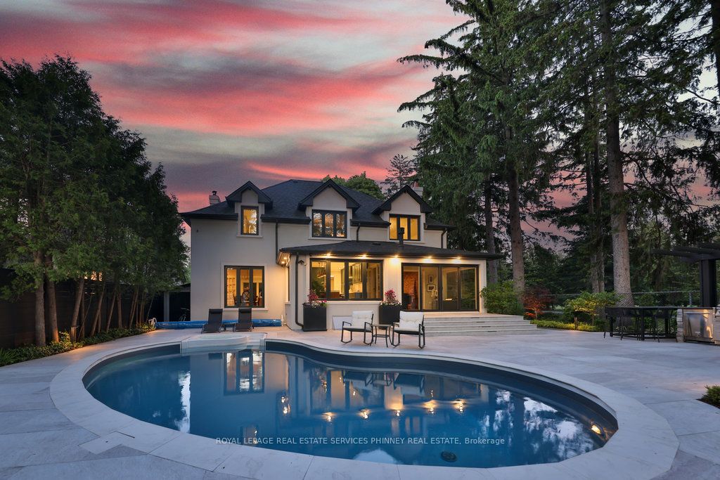 Located in a quiet cul-de-sac, this home brings Muskoka living to the city! The exquisite residence combines sophistication with contemporary features and boasts a picturesque backyard ideal for hosting memorable gatherings. Meticulously renovated from 2021 to 2023, every detail has been carefully attended to. The facade showcases sleek Indiana Limestone, complemented by black pearl granite walkways that shimmer in the sunlight. Step inside to a refined foyer adorned with a crystal mirror, plated in 24 Karat Gold. The expansive main level layout caters perfectly to family life, encompassing a living room, dining room, family room, and a sunroom with views of the outdoor living area. The kitchen stands as a focal point, showcasing custom walnut cabinets, Tuff Skin Marble countertops, high-end appliances, and a central island for casual dining. Upstairs, the primary suite offers ample space, featuring a sitting area overlooking lush front yard gardens and a luxurious 4-piece ensuite bathroom with dual sinks. Additionally, three generously sized bedrooms grace the second floor, one with a spacious sitting area adaptable for various purposes such as a nursery, home office, or entertainment room. No detail is overlooked in this residence. The fully finished basement with wainscoting throughout, a recreation room with a dry bar, a home gym with mirrored walls, and a spa-inspired suite including a sauna, 3-piece bath with multi-jets, and an oversized rain shower. Outside, the entertainment options continue with a built-in BBQ and fridge, a covered outdoor living area wired for television, and a gas fireplace for cozy evenings. Completing the outdoor oasis is a saltwater pool, perfect for cooling off on hot days, with both the liner and equipment recently replaced in 2022. The property overlooks 32 acres of beautifully manicured gardens. See attached list of upgrades.