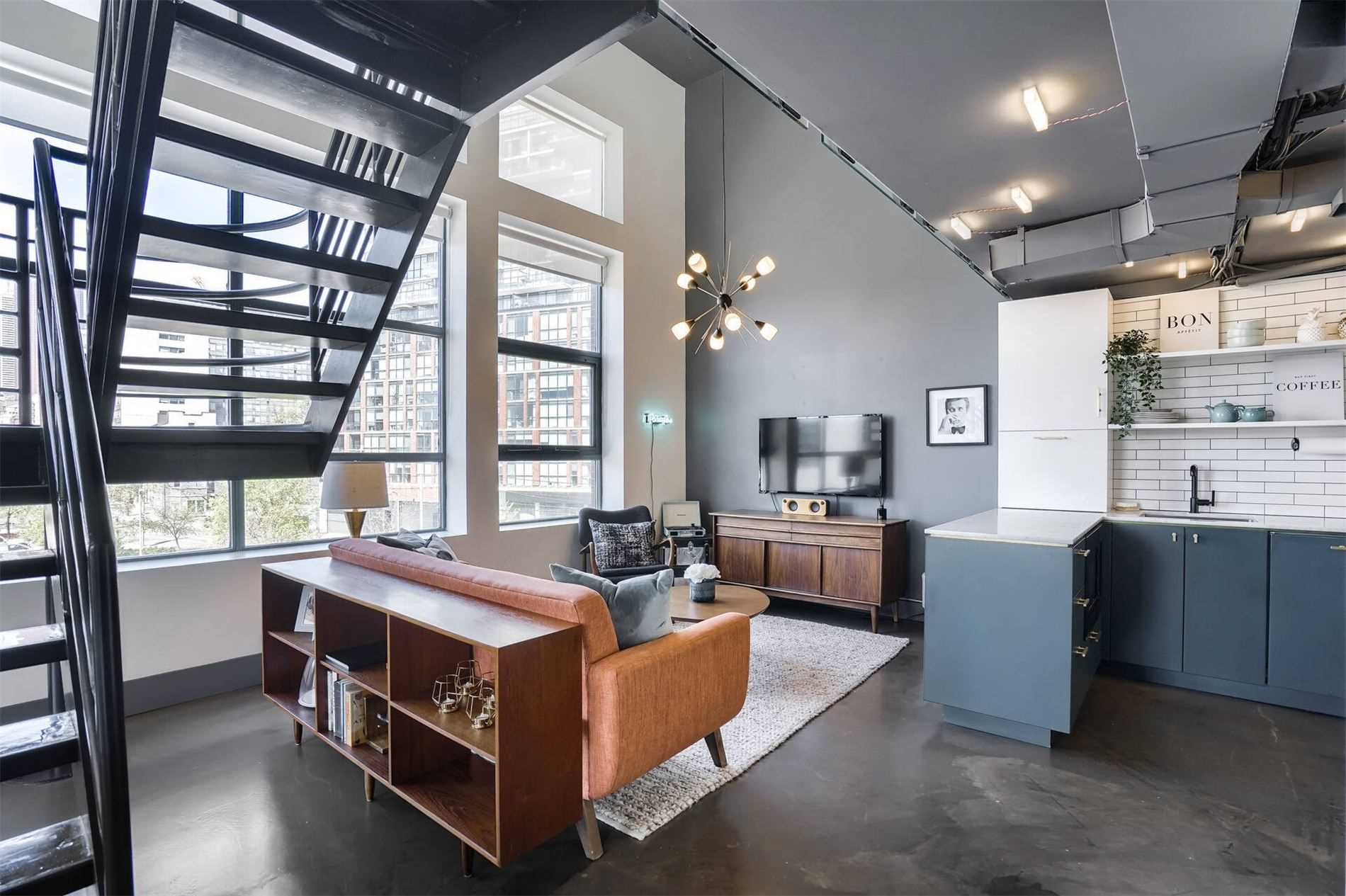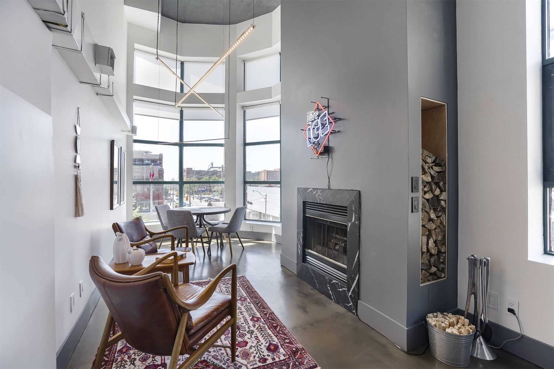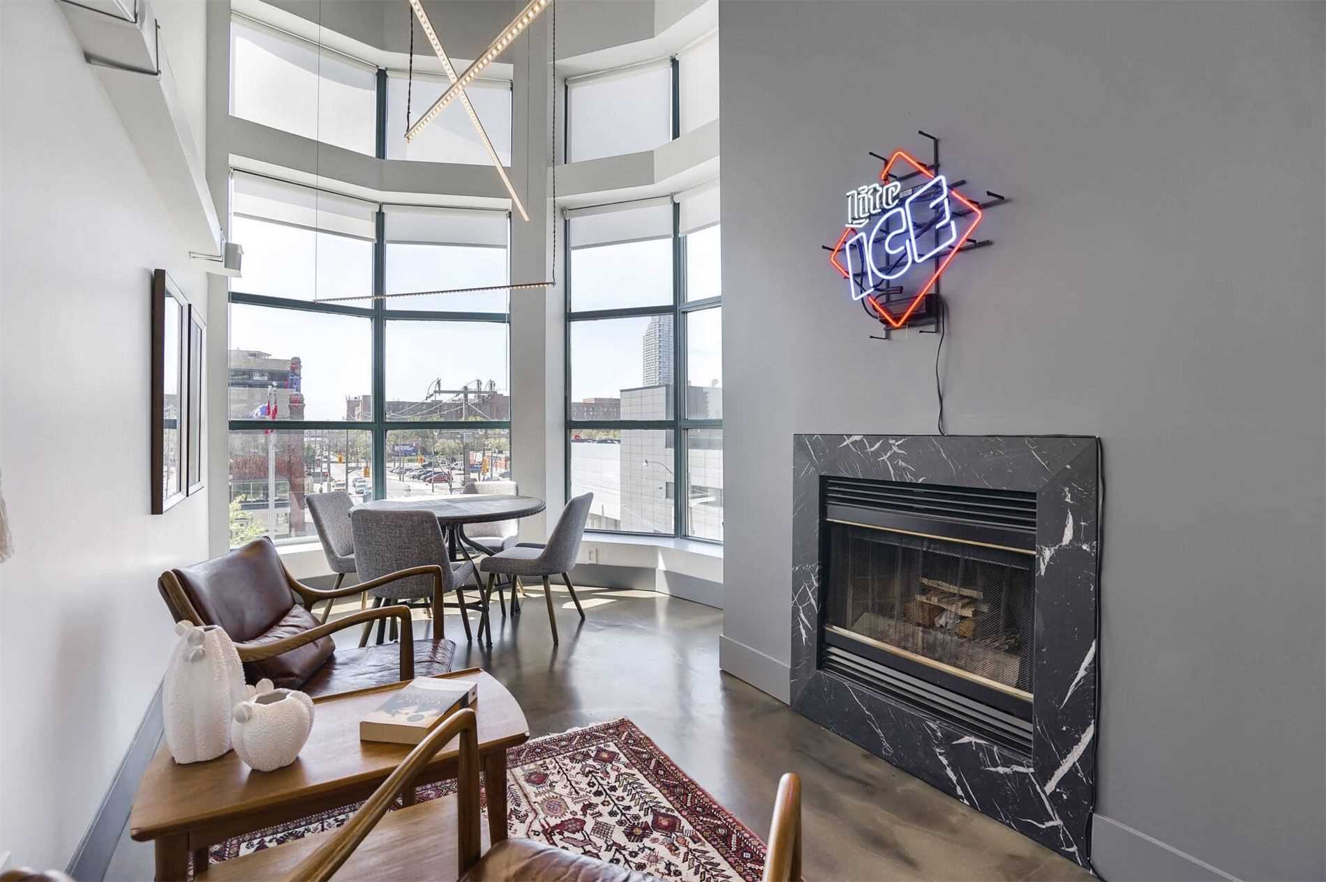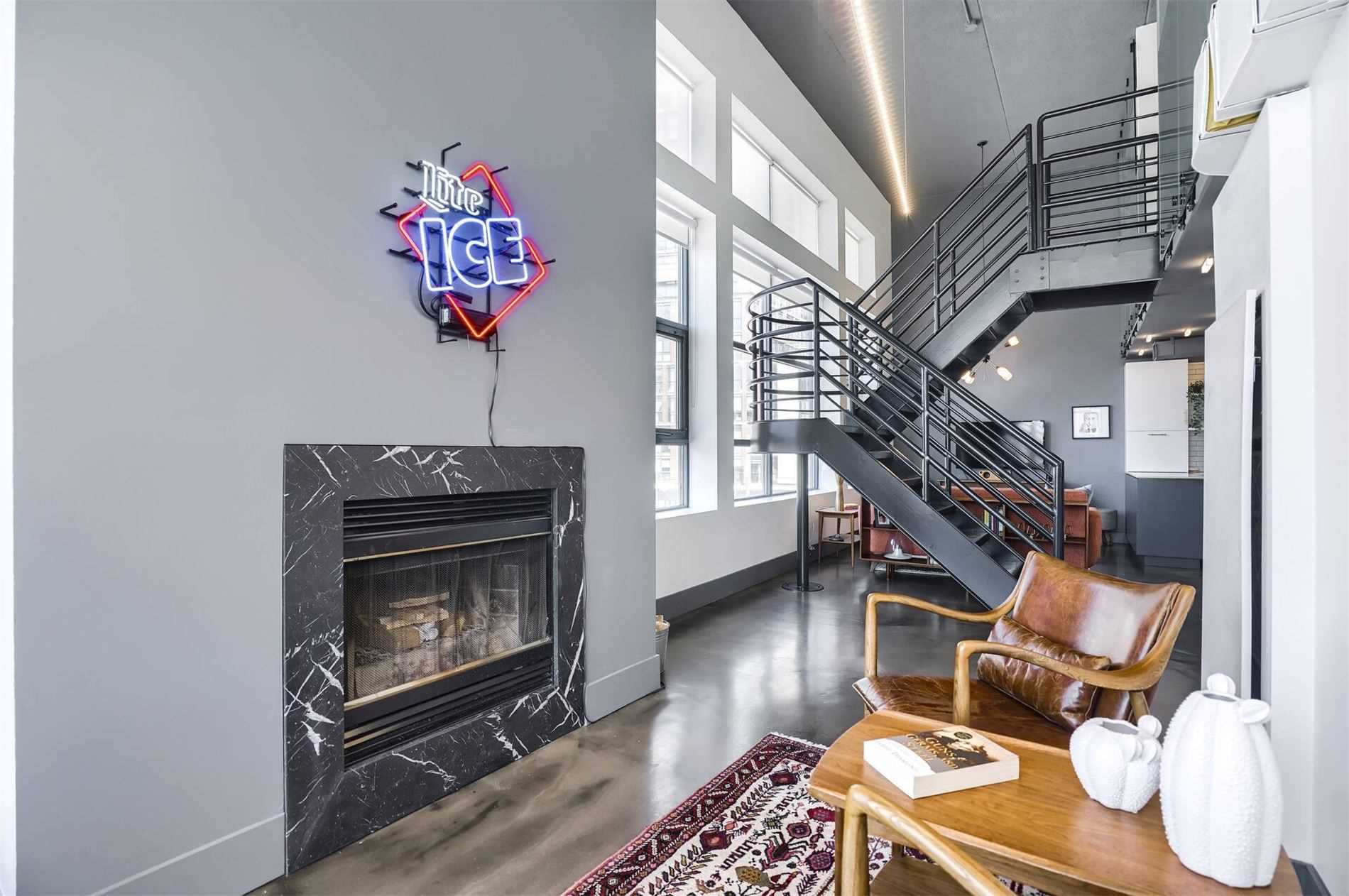 Uber Rare Boutique Loft With A New York Vibe. Put On Your Favorite Jams, Shake Up A Martini And Dance Away In The Glow Of City Lights. One Of A Kind Two Storey Residence With Unobstructed Panoramic Views Of Downtown And The Lake. South West Corner Unit. Professionally Designed With Custom Finishes Top To Bottom. Features: Floating Steel Staircase, Glass Walls, 16Ft Ceilings, Concrete Floors, Wood Burning Fireplace. Approx 1100Sqft Of Living Space.